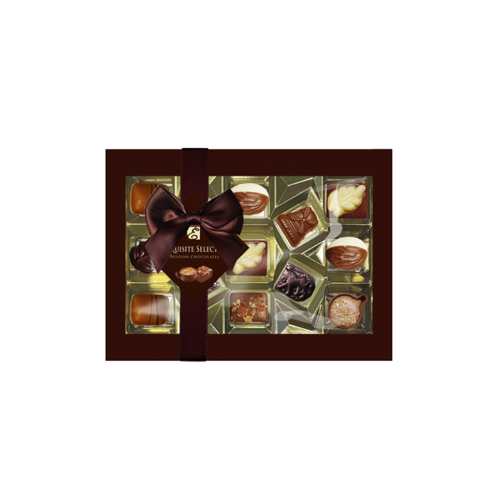 En lyxig presentask i brunt med stor rosett. 13st belgiska praliner i varierande smaker, fyllda med marsipan, karamell och hasselnötskräm.
