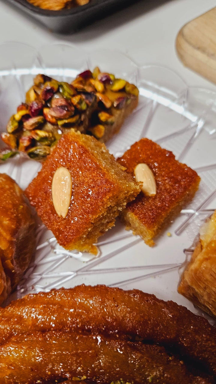 Harissa med mandel är en traditionell arabisk mannagrynskaka som bakas till en mjuk och saftig konsistens. Kakan får en härlig smak av smör och yoghurt, och på toppen dekoreras den med hela eller krossade mandlar som ger en mild nötig smak och ett vackert utseende. Efter gräddning dränks den i en varm, aromatisk sockerlag som gör varje bit perfekt söt och saftig.