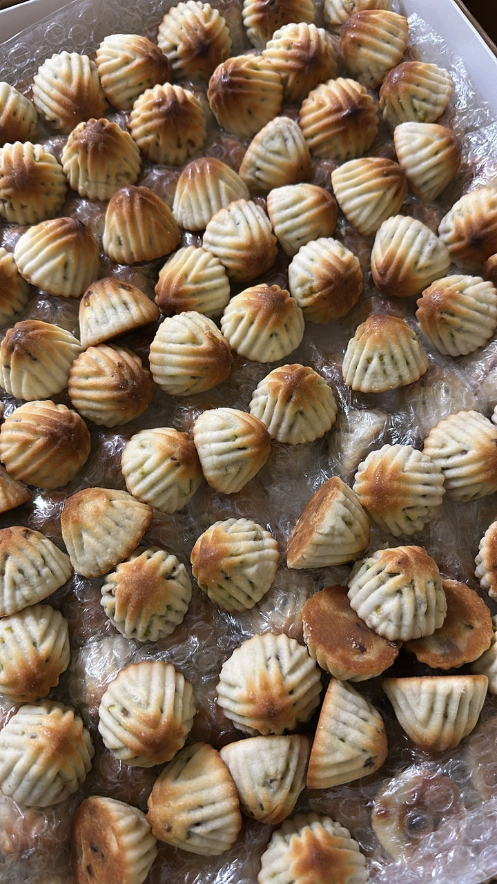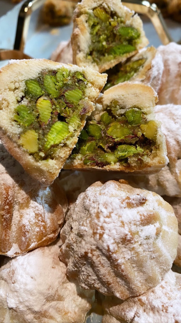 Mamoul med pistage är en klassisk och lyxig mellanösterndessert, känd för sin mjuka, smöriga deg och rika nötfyllning. Varje kaka formas traditionellt för hand och fylls med en aromatisk pistageblandning som ger en djup, nötig och naturligt söt smak. De bakas till en mjuk och lätt gyllene konsistens som smälter i munnen.