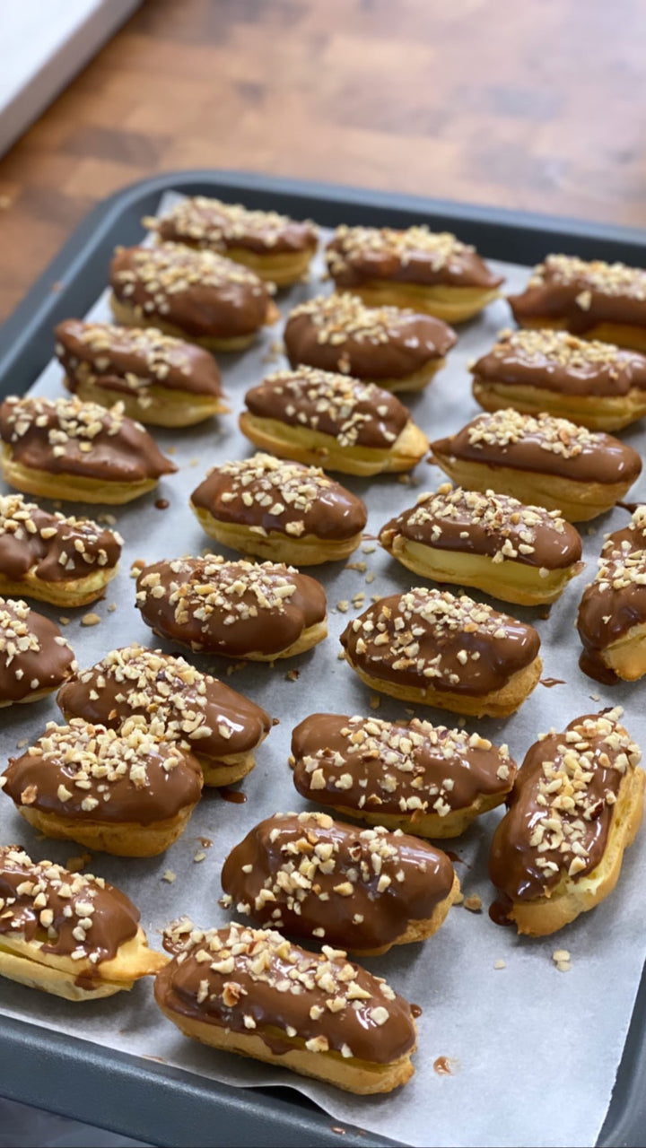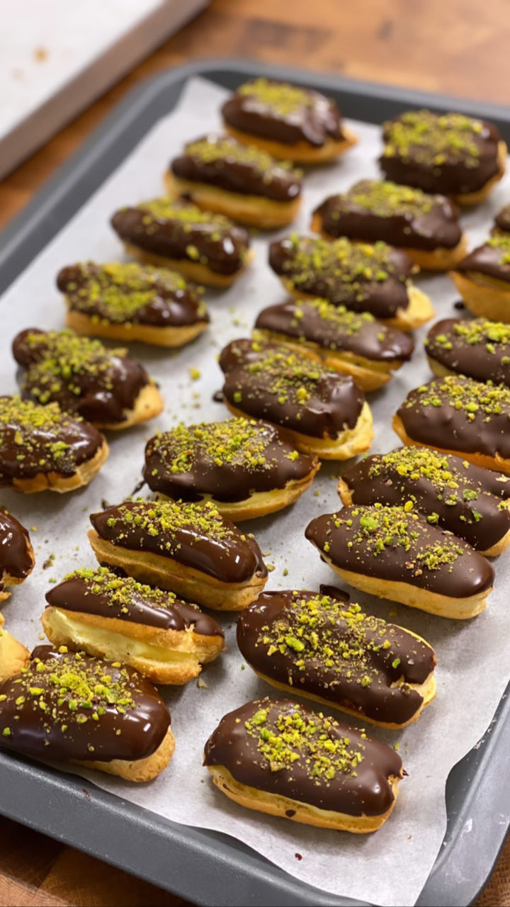 Mini Éclair är små, eleganta munsbitar gjorda på luftig och lätt chouxdeg som bakas tills den blir härligt frasig. Varje liten éclair fylls med en len och krämig vanilj- eller gräddfyllning och toppas med ett tunt lager glansig choklad. Perfekta som festliga små bakverk, på dessertbord eller som en lyxig liten godbit till kaffet.