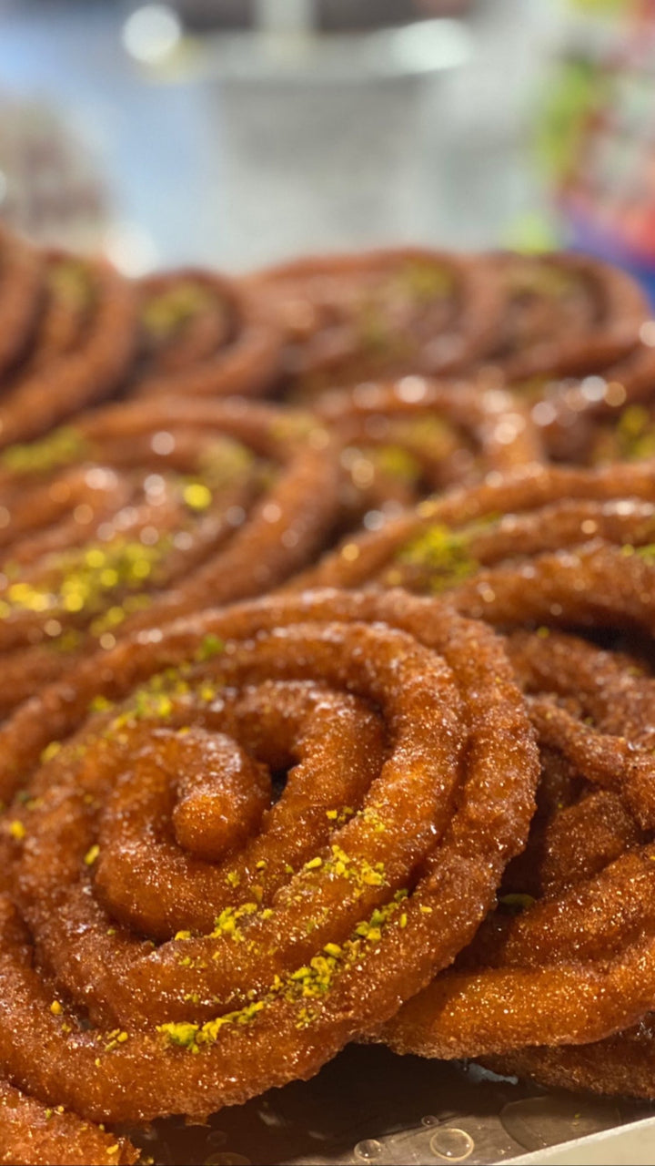 Moshabak är en klassisk arabisk dessert känd för sina vackra spiralformade mönster och sin härligt krispiga konsistens. De görs av en lätt och enkel deg som spritsas direkt i het olja, där de får sin gyllene och frasiga yta. Efter fritering doppas de i en varm, aromatisk sockerlag som ger en perfekt söt smak och en glansig finish.