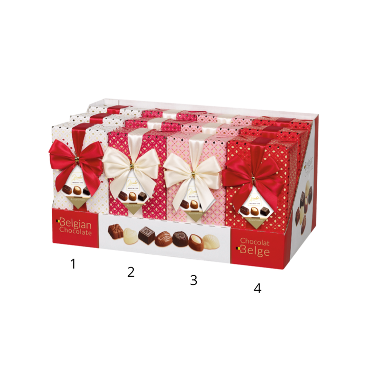 Chokladask inslagen i rödrosa färger med ett vackert matchande sidenband.