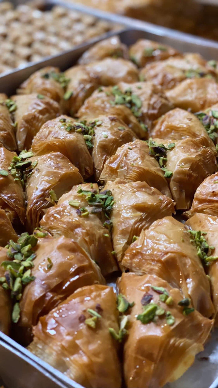 Warbat med kashta är en klassisk arabisk dessert gjord av tunna filodegsblad som bakas tills de blir härligt frasiga och gyllene. Efter gräddning fylls de med en silkeslen kashta-kräm som ger en mjuk, len och lyxigt krämig smak. Slutligen ringlas en lätt och aromatisk sockerlag över som gör desserten perfekt söt och saftig, och toppas med krossade pistagenötter för både elegans och extra crunch.
